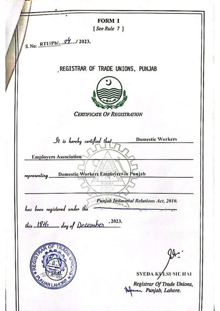 First Domestic Workers’ Trade Union registered in Pakistan Enhancing rights at work. The first ever trade union for domestic workers in Pakistan has been registered in Lahore by the Department of Labour Punjab, under the Industrial Relations Act 2010. This marks an important step in recognising and expanding legal coverage to vulnerable workers in the informal economy.